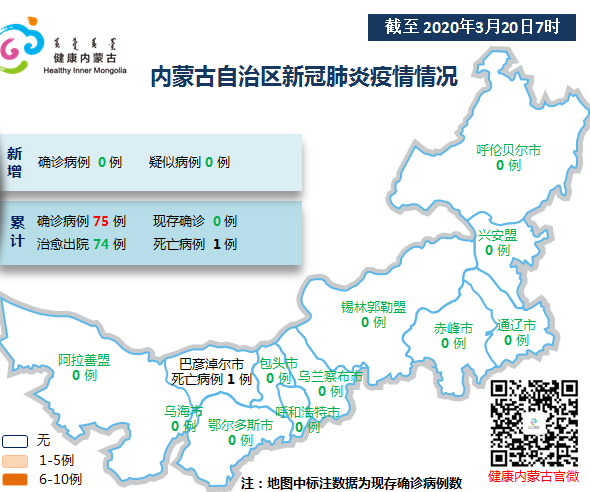 2020年3月19日7时至20日7时,内蒙古自治区报告无新增新冠肺炎确诊病例,无新增疑似病例。截至3月20日7时,内蒙古自治区累计报告新冠肺炎确诊病例75例,治愈出院74例,死亡1例。