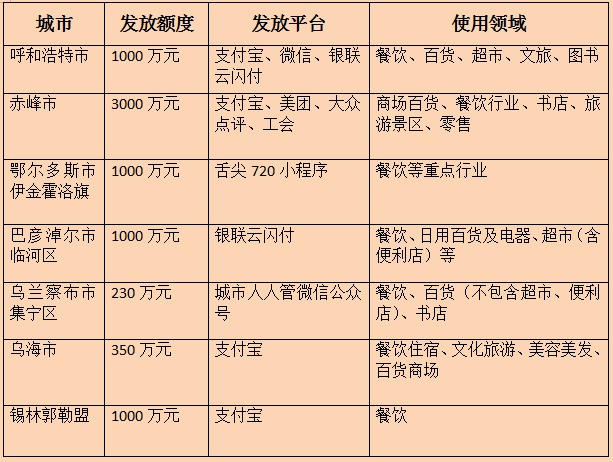 4月15日起,内蒙古自治区乌海市将通过支付宝发放首批200万元消费券,其后还将发放150万元消费券。乌海市是内蒙古第七个发放消费券的城市。此前,赤峰市、呼和浩特市、鄂尔多斯市伊金霍洛旗、锡林郭勒盟、巴彦淖尔市临河区、乌兰察布市集宁区都通过支付宝、微信、银联等平台向居民发放消费券,其中赤峰市发放3000万元,乌兰察布市集宁区发放230万元,其他地方均为1000万元。加上乌海市发放的350万元,内蒙古这七个城市发放的消费券总金额近8000万元。