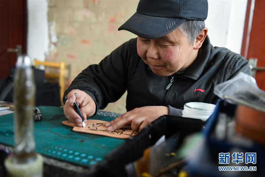 内蒙古鄂温克族自治旗锡尼河镇村民米格木尔在制作皮雕(2020年4月15日摄)。新华社记者 刘磊 摄