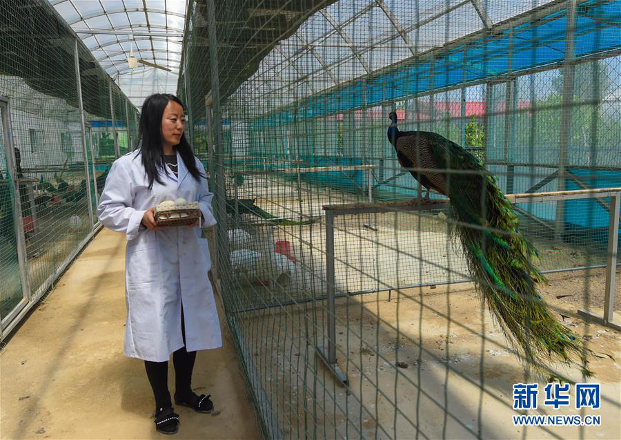 周海南在内蒙古兴安盟乌兰浩特市义勒力特镇蒙雀养殖专业合作社照料孔雀。养殖孔雀带动贫困户脱贫致富(2018年5月21日摄)。新华社记者 彭源 摄
