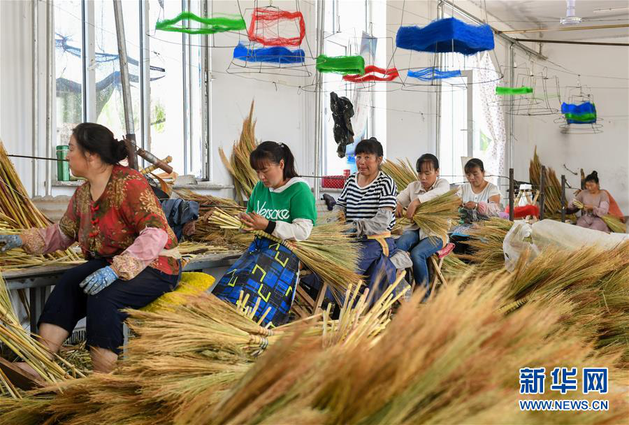贫困户在内蒙古赤峰市巴林左旗林东镇扶贫车间内制作笤帚(2019年8月5日摄)。新华社记者 彭源 摄