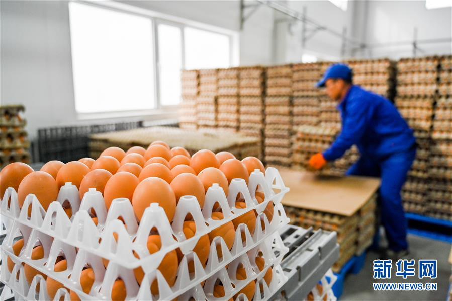 内蒙古乌兰察布市卓资县十八台镇村民在当地金鸡产业园区厂房内分拣鸡蛋(2020年3月26日摄)。新华社记者 连振 摄