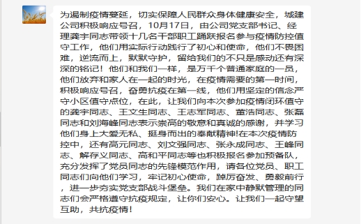城建公司党支部对本次在疫情防控值守中挺身而出、冲锋在前的志愿者同志进行表扬,并号召全体党员向他们学习,牢记初心使命,踔厉奋发、勇毅前行,进一步夯实党支部战斗堡垒。