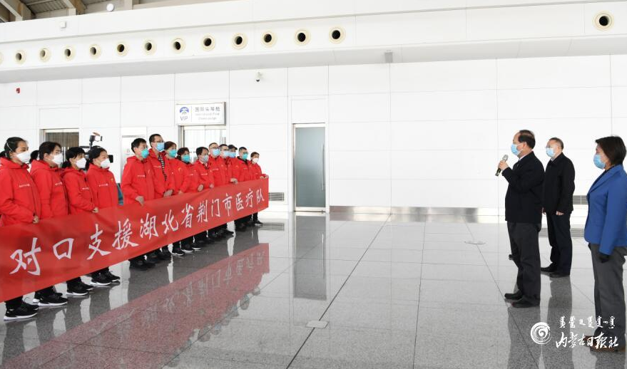 2月15日,内蒙古自治区对口支援湖北省荆门市医疗队第二批成员启程出发。自治区党委书记、人大常委会主任石泰峰,自治区党委副书记、自治区主席布小林到呼和浩特白塔机场为医疗队壮行,代表自治区党委、政府向医疗队成员送上祝福,勉励大家担当使命、英勇奋战,并通过他们向全体支援湖北省的内蒙古医护人员致以崇高敬意、表示衷心感谢。