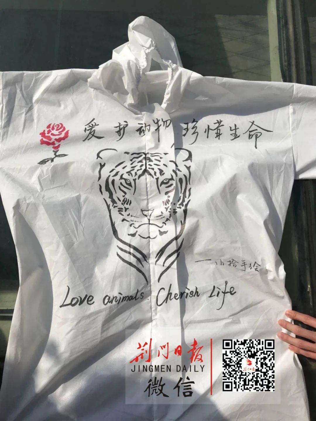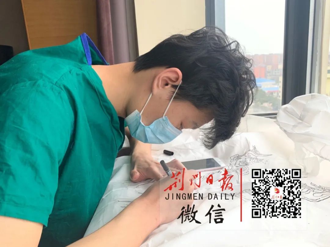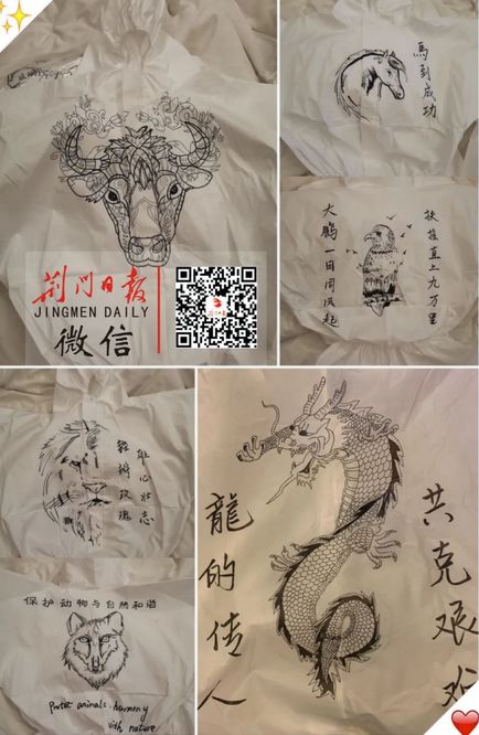 每天下班后,拾兆丰和有书画功底的关智芳就在各自的房间里忙开了。他们以隔离服为画板,巧用心思绘出了一件件作品,送给了医护人员。他们给于海霞的隔离服设计了主题《铿锵玫瑰》,背面是意为早日康复、战胜病魔的蒙文,同时也带去了对草原同胞们的祝福;重症病区主任黄仁寅的战衣主题是西游记,因为无论是西方的奥德赛还是东方的西游记,在行将成功的道路上都会经历九九八十一难,寓意中华民族从没有被困难吓倒;他们为京山市人民医院大内科主任叶昊创作主题为《牛》的“战衣”,寓意着共产党人冲锋在前,踏实肯干,俯首甘为孺子牛……