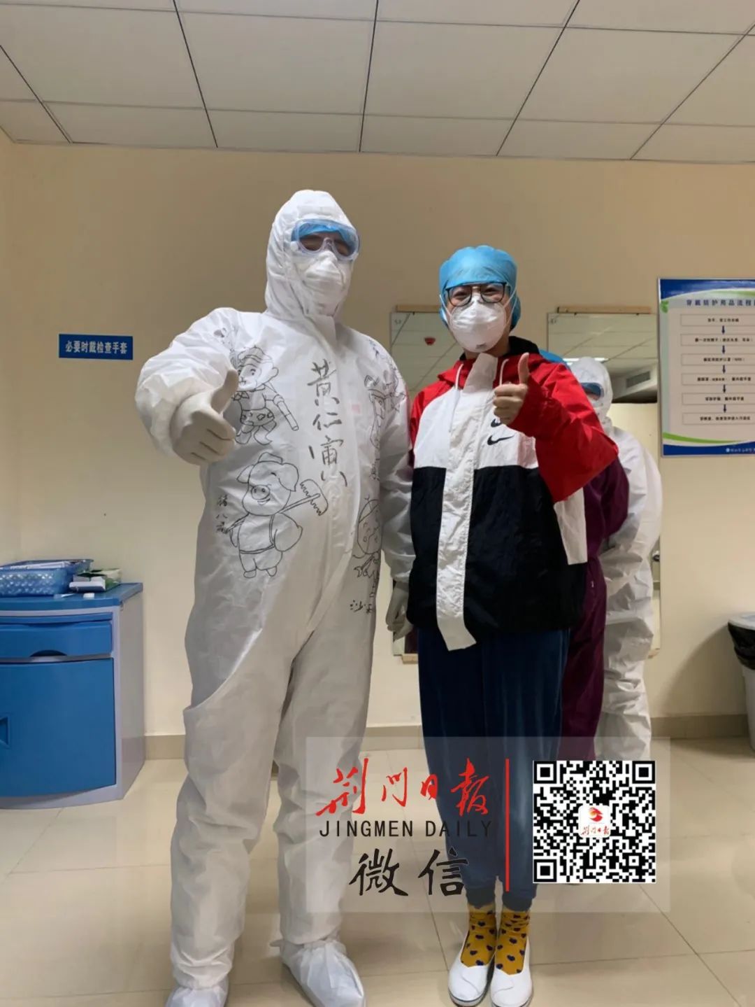 3月6日上午8点,20多名医护人员穿着绘有手绘画的隔离服,走进京山市仁和医院的隔离病房。病人们纷纷拿出手机,悄悄拍摄他们的身影,医护人员发现后,主动上前和病人们合影——顿时,病房里的沉闷气氛一扫而空,阵阵笑声在一间间病房里荡漾开来……