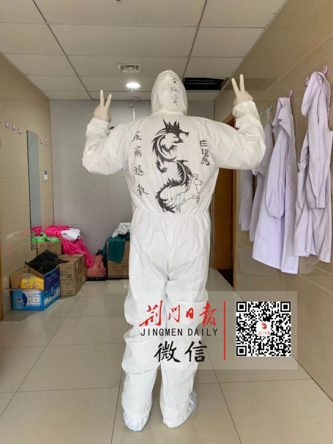 拾兆丰说:“你属马,就在隔离服上用一匹马来标注自己,祝我们抗击病毒马到成功。”关智芳高兴地穿上了手绘版的战袍走进了病区。
