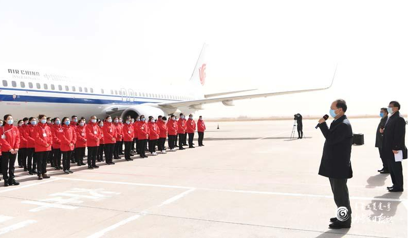 3月18日下午,自治区党委书记、人大常委会主任石泰峰在鄂尔多斯伊金霍洛机场,迎接我区援鄂医疗队首批返程人员,欢迎英雄平安凯旋。内蒙古日报社融媒体记者袁永红摄
