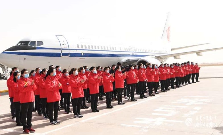 3月18日下午,我区援鄂医疗队乘机飞抵鄂尔多斯伊金霍洛机场。内蒙古日报社融媒体记者袁永红摄